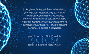 Najserdeczniejsze życzenia z okazji Świąt Wielkanocnych składa rektor Politechniki Rzeszowskiej prof. dr hab. inż. Piotr Koszelnik.