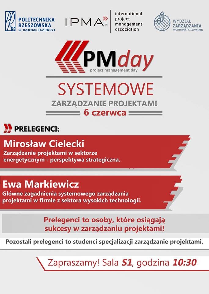 Wydział Zarządzania Politechniki Rzeszowskiej po raz kolejny zaprasza na PMDay Politechniki Rzeszowskiej. Hasło przewodnie seminarium to „Systemowe zarządzanie projektami”.